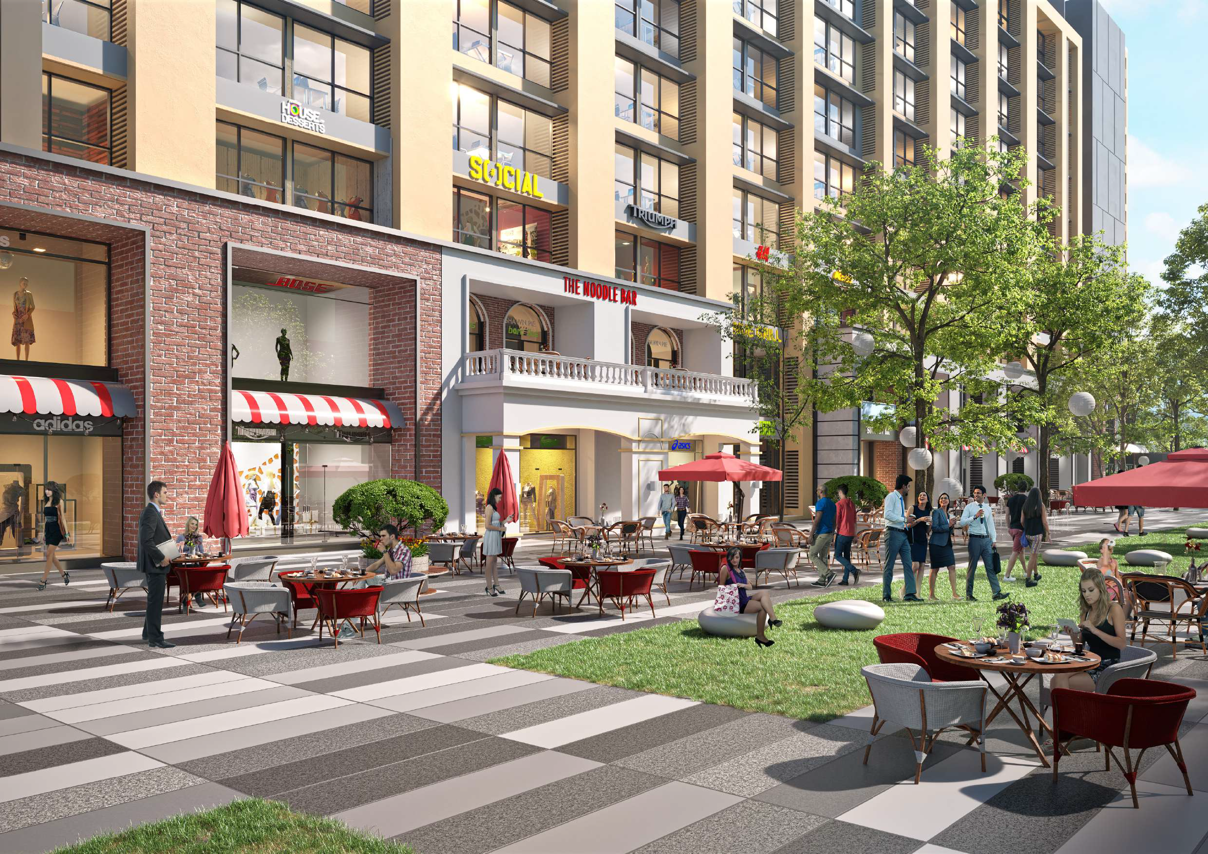 Lush landscaped gardens create serene green spaces with walking paths, seating nooks, and native plants promoting relaxation amid urban commercial hub.